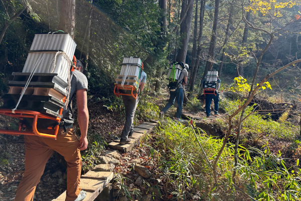重機やヘリが使えない場所でも、人の力で確実に荷を届けます。